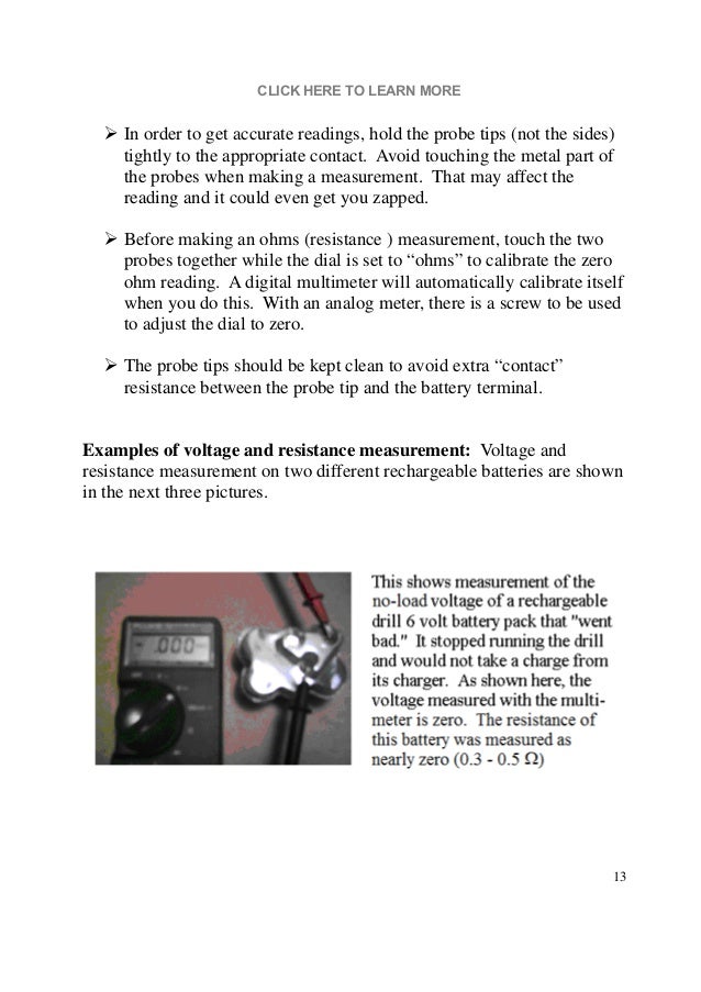 Look at the digital or meter display on the multimeter or voltmeter. If a 6 volt battery is reading below 4.3 volts it has a short cell. The battery only needs to be put on the charger for two minutes (this will not damage the charger if only done for two minutes). Use a temperature compensating battery hydrometer for this test. Testing for an open cell in a flooded/wet cell battery.